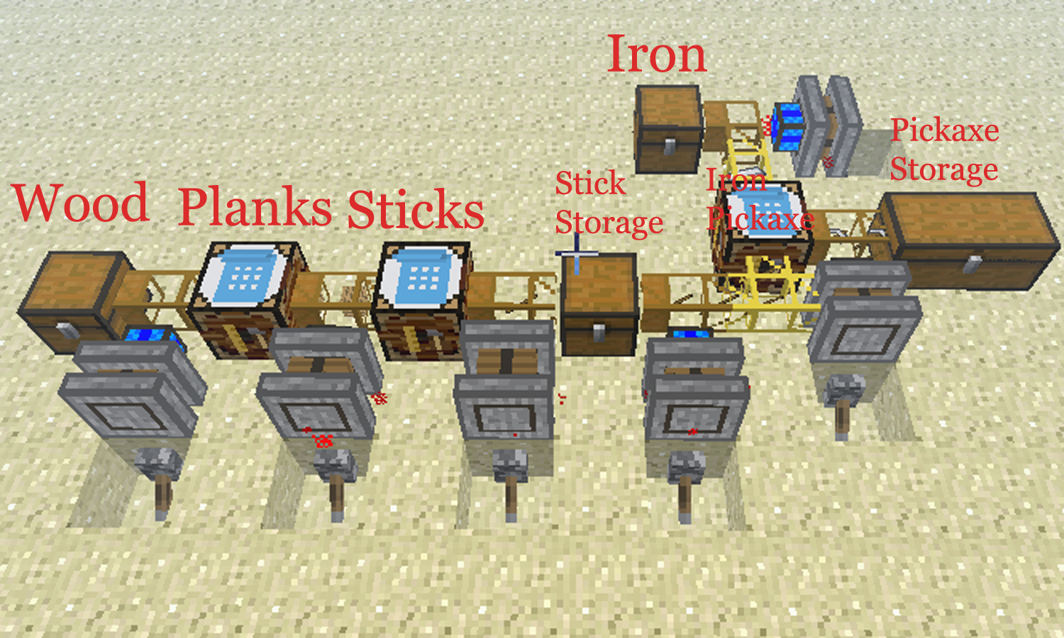 For example, if crafting Planks from a single Wood, then one could put a chest next to the table filled with Wood (possibly piped into the chest) and the Wood would remain in the chest. Then, when a wooden pipe next to the table was powered, it would pump Planks out of the table, using the Wood in the chest as the source of the craft. This works with any item and any crafting recipe, and placement of the items in the chest does not matter as long as they are all present. If not all items are present either in the chest or in the crafting table itself, then the craft will not be done and the pipe will not get an output item.
