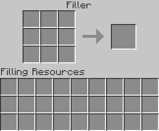 Right-clicking on a filler brings up the filler interface. The top 3x3 area is for a filler pattern, and the resources area is where you place the materials to build with. There are 6 patterns that can be used. Patterns are made by placing Bricks and/or Glass in the top 3x3 area. When there is a valid pattern in the filler, the pattern icon will be visible in the small space in the top of the interface, and on the sides of the filler. The lights on top of the filler will also have turned green.