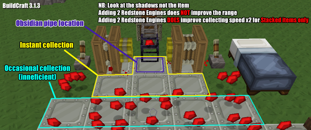 Redstone engines gather up one item per stroke, while other engines gather multiple items up at a time. Without the engine, items must touch the pipe in order to be collected.